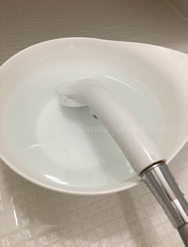 水で溶いたクエン酸のペーストをヘッド部分に塗って濡らしたキッチンペーパーで包み、さらにサランラップを巻いてしばらく放置します。