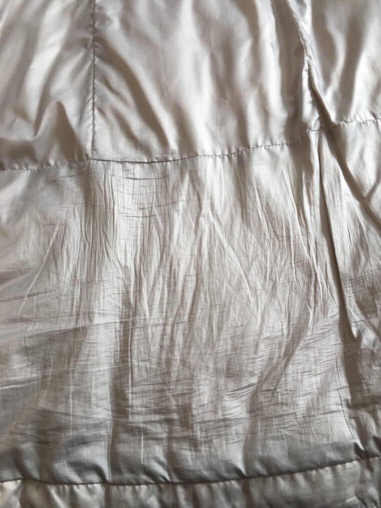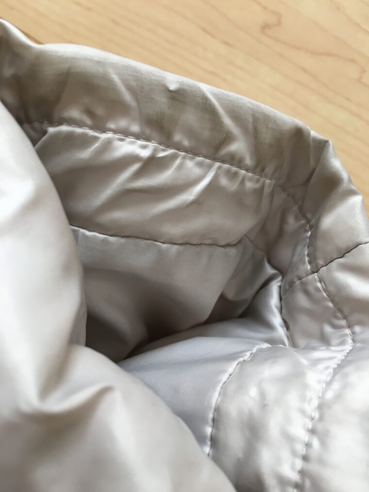 羽毛布団は区切られたキルティングの一つ一つが大きかったのでやり易かったのですが、ダウンコートはキルティングの区切りが細かいので、やりづらいし結構時間がかかりました。