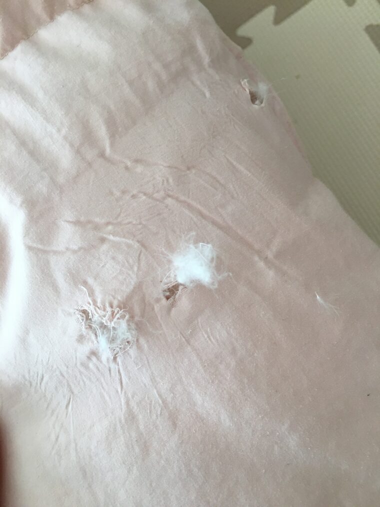 3箇所も破れているし、フワフワだった羽毛はキルティングで区切られたゾーン毎に小さなボールのように固まっていました。